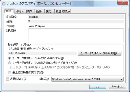 操作のタブで、新規操作を追加。操作はプログラムの開始のままで、プログラム/スクリプトのフォームにC:\Users\yuki\AppData\Roaming\Dropbox\bin\Dropbox.exeと追加。